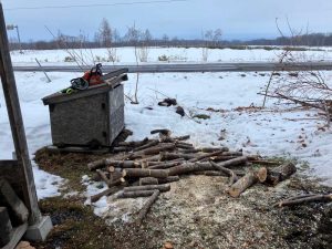 春になり葉っぱが茂ったときに宿からの展望に差し障る木を切るのも大事な今の仕事。あまり太くなると伐採に危険が伴うので早いうちに見つけて切り、薪にします。調子の良くないチェーンソーも機嫌の取り方がわかってきたので効率が上がりました。