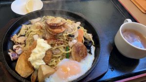 北見のB級グルメのオホーツク塩焼きそば。大小のホタテやオニオンソテーなどオホーツクの具材が彩られていてこれも”さすが”の料理。宿の料理のためにも勉強になることばかりでした。