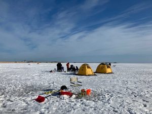 今日も食材を調達しに野付湾の氷平線に。釣りのおっちゃんおばちゃん、面白いポーズで撮影する若いカップル、そして高校生の体験学習と凍った海の上は楽しさにあふれていました。手前のイスがボクの席。プラスの気温で風もなく暖かいのでテント無しでも爽快!
