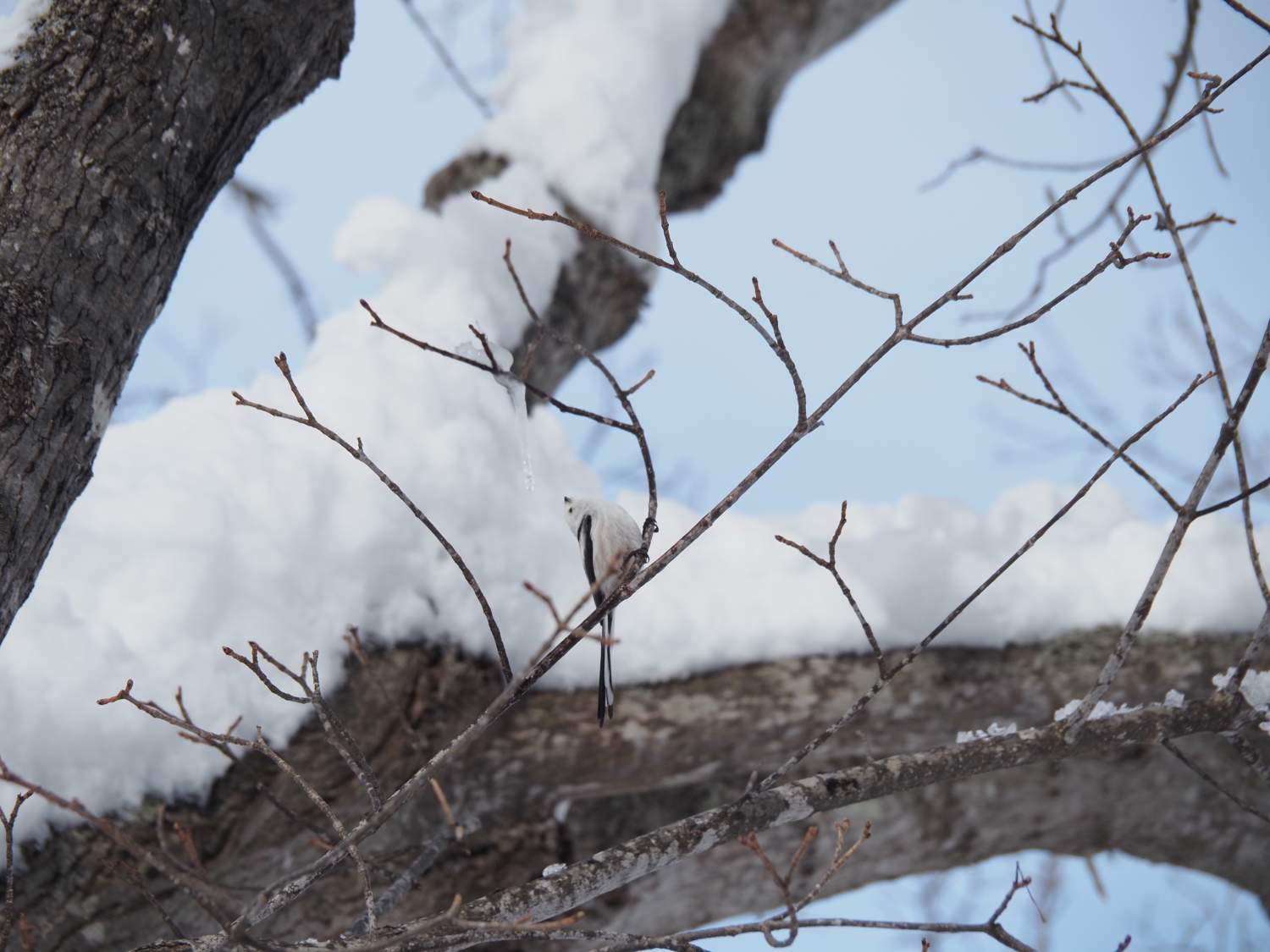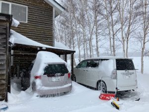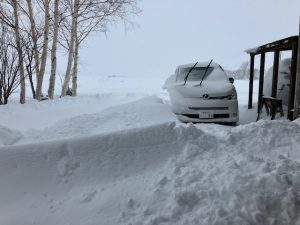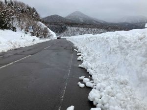 ウトロは清里の倍ぐらいの積雪!まだ歩道の除雪がされていなくて背丈ぐらいの壁になっています。上の写真はこの上によじ登って撮影。岩尾別方面の道も閉鎖されていました。
