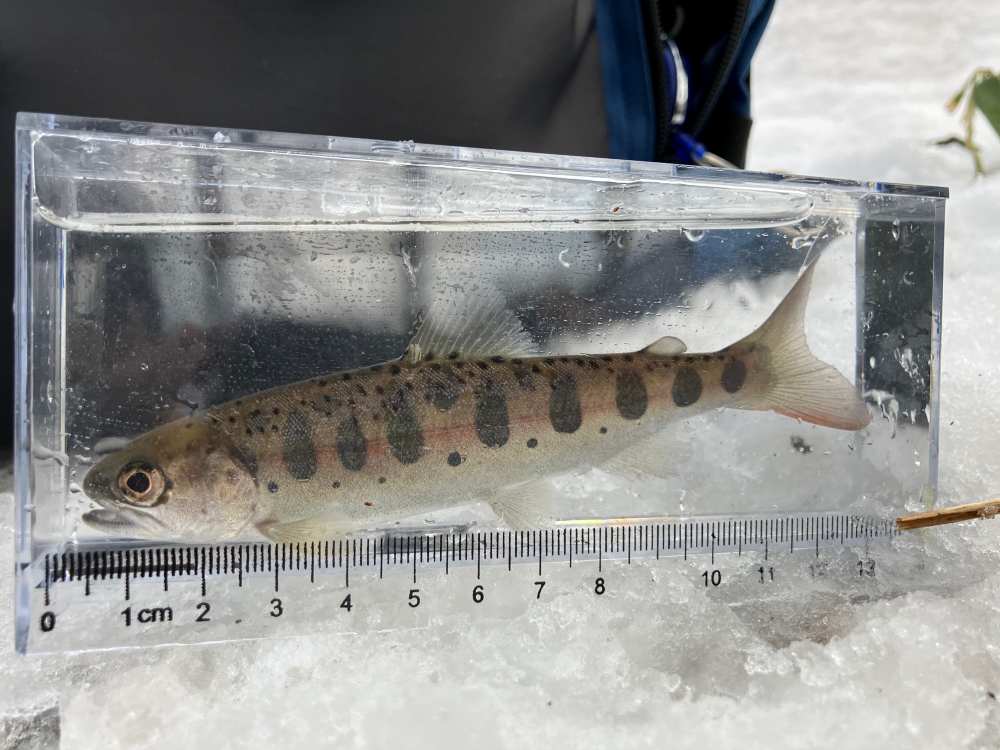 ちっちゃいけどヤマメは良く釣れました。今回は食べるのではなくこの観察ケースに入れてまじまじと見るのが目的。渓流の宝石と言われるようにホントにキレイな魚です。いつもは釣れるオショロコマとアメマスが全く釣れなかったのは何かの異変だとおもうけどヤマメだけでもいたので一安心。2年後にはサクラマスとなって戻ってきてくれるでしょう。