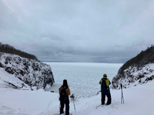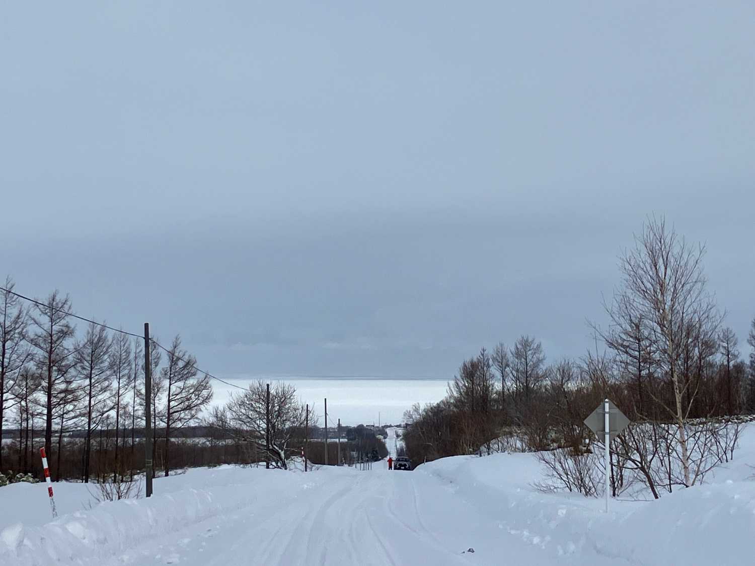 知床へのスノーシューツアーも始まりました。最近来た流氷は密度も厚さも薄いけどオホーツクを代表する現象であり絶景です。まずは天に続く道から直角に伸びる「流氷に続く道」を下っていきます。