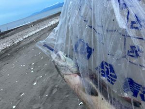平日は工事で通行止めだけど土日だけ通れる道を1キロほど走るとブッコミ釣りのおっちゃんたちが数人。ダメもとでとりあえず浮きルアーを投げていると射程圏内にサケが何度か跳ねました!いるじゃん!なかなか食ってこなかったけど1時間ほどしたころにやっとオスをゲット。砂浜にずり上げるので魚は砂の固まりに・・ざっと洗ったけど料理前にちゃんと砂を落とすのが大変だ~。砂浜でサクラマスは釣っているけど鮭は初めて。この時期でも釣れることがわかったのと斜里と網走は一人釣り竿3本までのルールができて一人の専有面積が減ったので浮きルアーの釣り人などが入る余地ができたのはよかったです。明日からしばらくは海は荒れるので次は淡水の釣りになるかな・・Wさんは湖で大ニジを釣ったようだし。