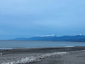 知床への流入河川の河口でサケ釣りをしていいのはほぼ一ヶ所だけそこも全く釣れないようで誰もいません。こりゃダメだ、あとはまだ行ったことのない斜里の砂浜をのぞいて帰ろう・・低気圧が近づいてきてきて段々と雲行きが怪しくなってきましたが海越しの知床連山は見事です。