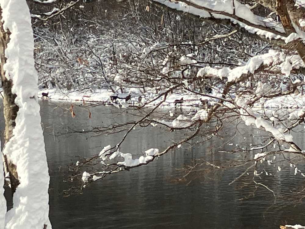 湖畔に出ると30頭以上のエゾシカパラダイス!・・水を飲んだり波打ち際の落ち葉を食べたりしているのでしょう。まさかこんなときに人間が来るとは!とビックリして警戒音を出し逃げていきました。