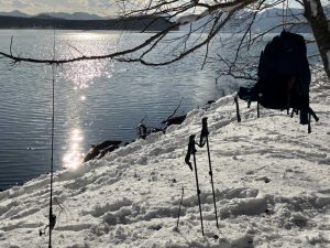 大雪で通行止めだった峠道も11時に解除されたのでコンパクトロッドとルアーをいくつかもって湖へ。大雪で林道は車で通れないのでスノーシューです。しかし・・湿雪とはいえ場所により60cmぐらい積雪がありストックが半分以上もぐるほど。当然誰もいないし足跡も無いので約1時間大汗をかきながらラッセルです。