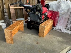 ヒビだらけになって切れてしまったキャタピラーを新品に交換しましたが、劣化する一番の原因はどうやら紫外線かも・・キャタの素材もタイヤのような丈夫なゴムではなく、芯金も入っていないプラスチックのようなゴム?なので紫外線には弱そう。でも物置きには入らないし専用の車庫を作るのには材料も買わねばならないし、さて・・と考えたら「とりあえずキャタだけカバーすればいいな」と思いつきました。材料はベッドを解体したときの板。寸法を測って少し余裕をもたせて材料カット、木工の接着剤は氷点下の屋外では固まらなくなってしまうので一晩家の中で乾燥し完成。まあとりあえずいいかな、という感じですが物置きのボクのおもちゃたちもそろそろ断捨離する時期なのかなぁ・・