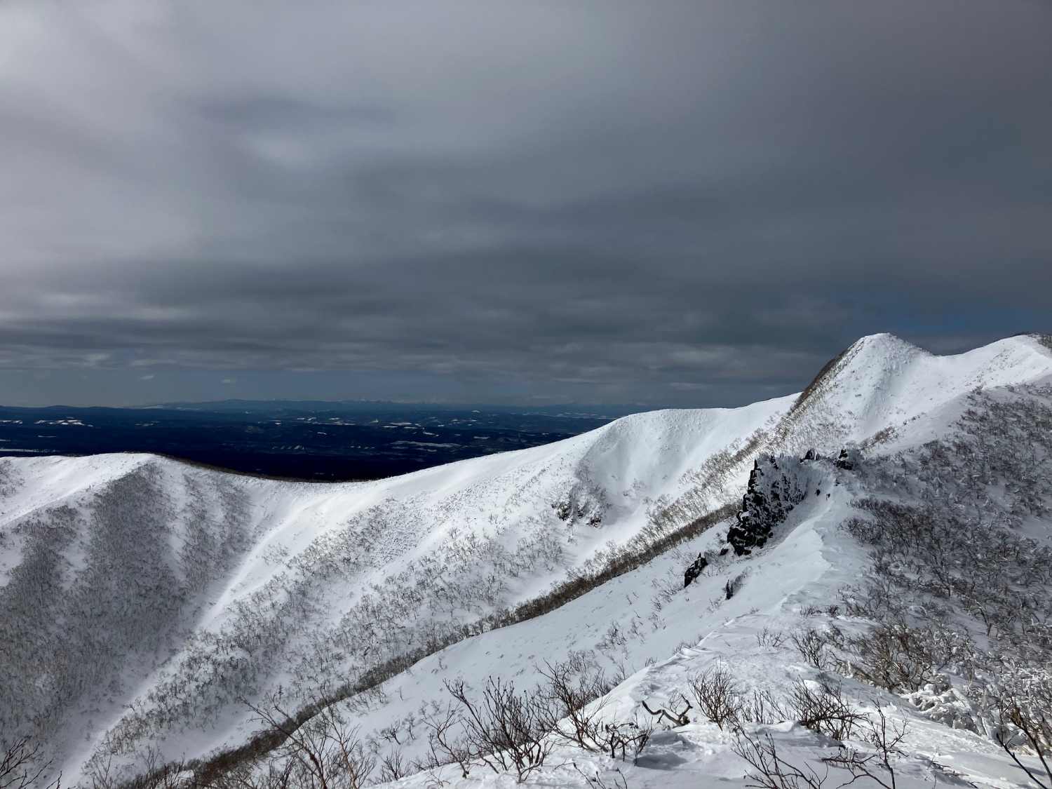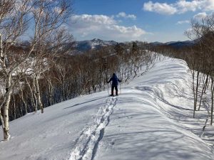 大荒れだ、大雪警報だ、学校は臨時休校だ、と世間が構えていた昨日、気圧配置や等圧線の間隔、流氷の具合などをみて、そんなに荒れるかなぁ・?まあ行ってみよう、とルベス岳へ。風はそこそこ強かったものの昼頃には段々と晴れてきて自分の予報が当たりました。暑いときは稜線に、冷えそうなら風裏にとコースを変えながら登っていきます。