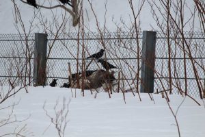 オンネベツ川河口近くでワシやカラスが騒がしいな、とおもったらやっぱり鹿の亡骸が。宴会になっています。