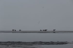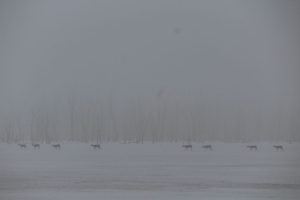濃いめの霧の中、凍った海を渡るエゾシカの群れ。